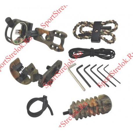 Комплектность: прицел 3 Пина с подсветкой, полочка 3 щётки, пип-сайт с резинкой, вязочка для кисти, стабилизатор, веревка для петли релиза, ключи для установки и регулировки аксессуаров.